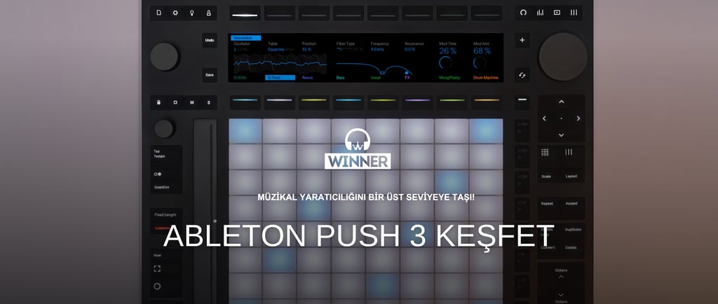 Ableton Push 3 Nedir? Ableton Push 3, müzik üretimini daha sezgisel ve yaratıcı hâle getirmek için tasarlanmış bir midi kontrol cihazıdır. Ableton Live yazılımıyla tam uyum içinde çalışır ve iki farklı versiyonu bulunur: • Controller Versiyonu: Bilgisayara bağlı şekilde çalışır. Ableton Live’ı doğrudan kontrol etmeni sağlar. • Standalone Versiyonu: Bilgisayara ihtiyaç duymadan, tamamen bağımsız şekilde müzik üretmeni mümkün kılar. Her iki modelde de hassas pad yapısı, güçlü enstrüman kontrolü ve gelişmiş performans özellikleri bulunur. Push 3, ister ev stüdyosunda üretim yapan biri ol, ister sahnede performans sergileyen bir DJ — müziğini dokunarak şekillendirmeni sağlar. Push 3, müzik üretiminde özgürlük, hız ve ilham arayan herkes için tasarlanmıştır.